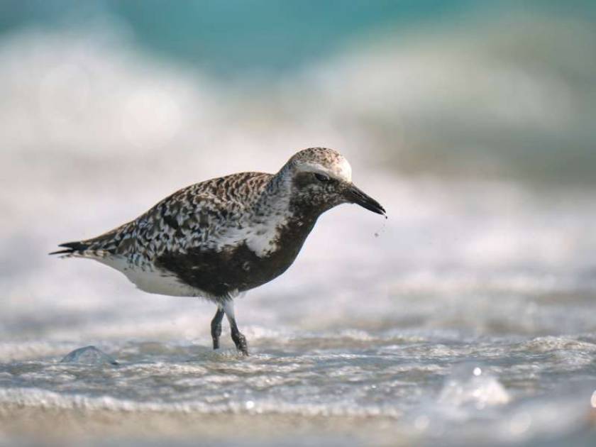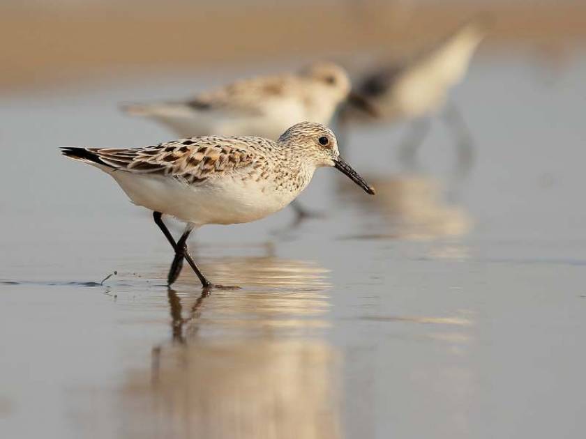 The Sanderling’s black legs blur as it runs back and forth on the beach, picking or probing for tiny prey in the wet sand left by receding waves. Sanderlings are medium sized “peep” sandpipers recognizable by their pale nonbreeding plumage, black legs and bill, and obsessive wave chasing habits.