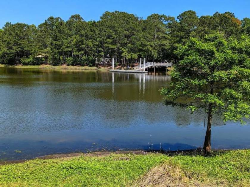 A 53-acre park with a large pond, fishing pier, open fields, wooded areas, and walking trails.